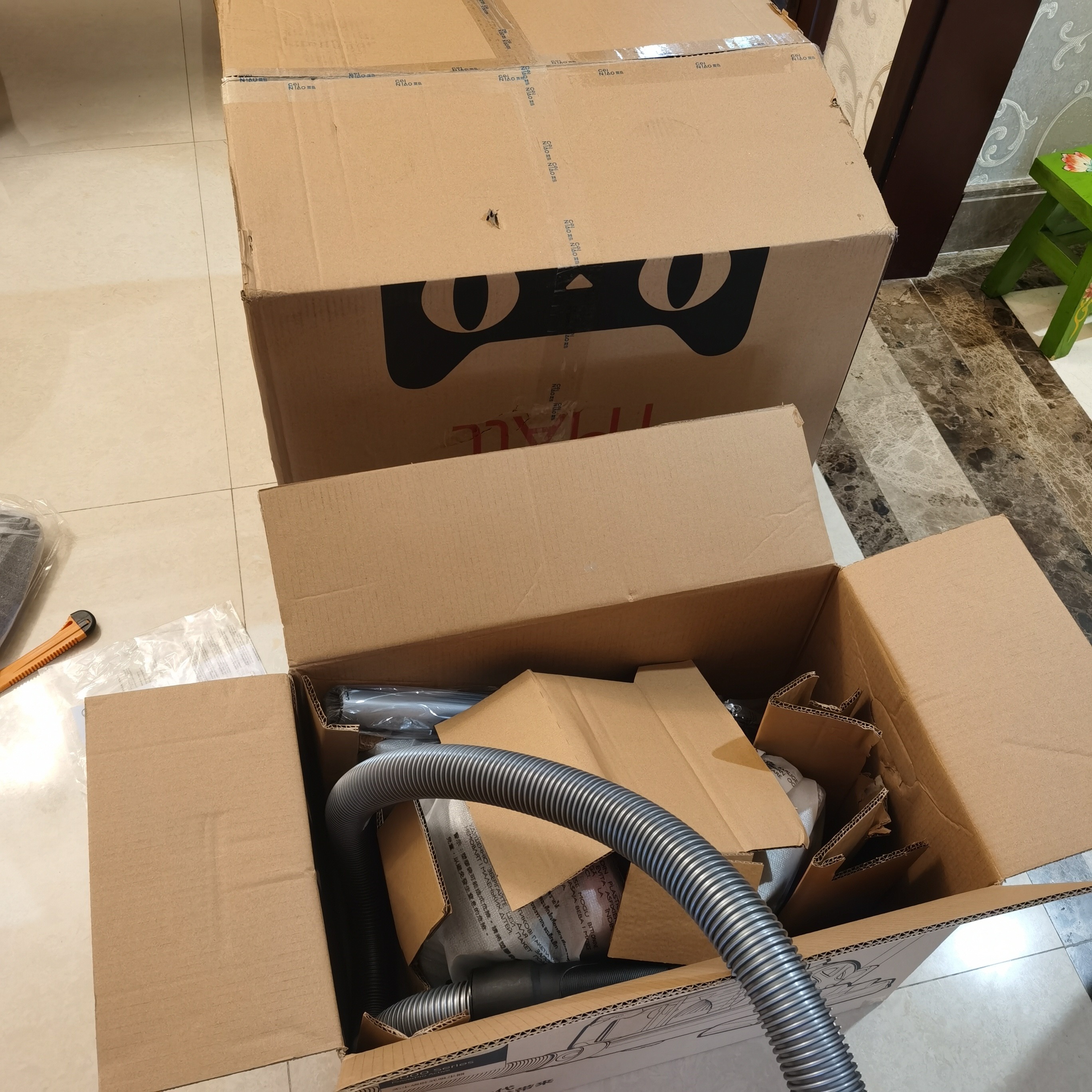 大箱套小箱,包装很好,物流很快,送上门的。试用了一下机子,吸力很好,噪音不大。建议公司录制安装小视频丶拆过滤网小视频。还有客服态度好沒有用,要会解决问题,不要答非所问。